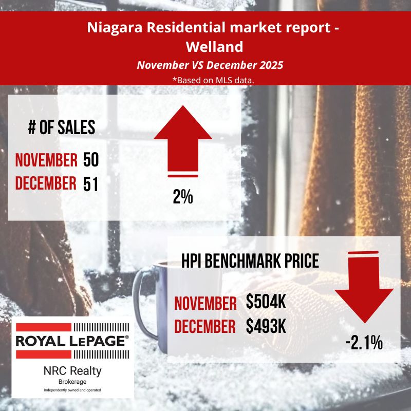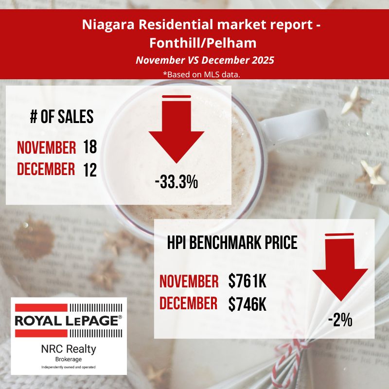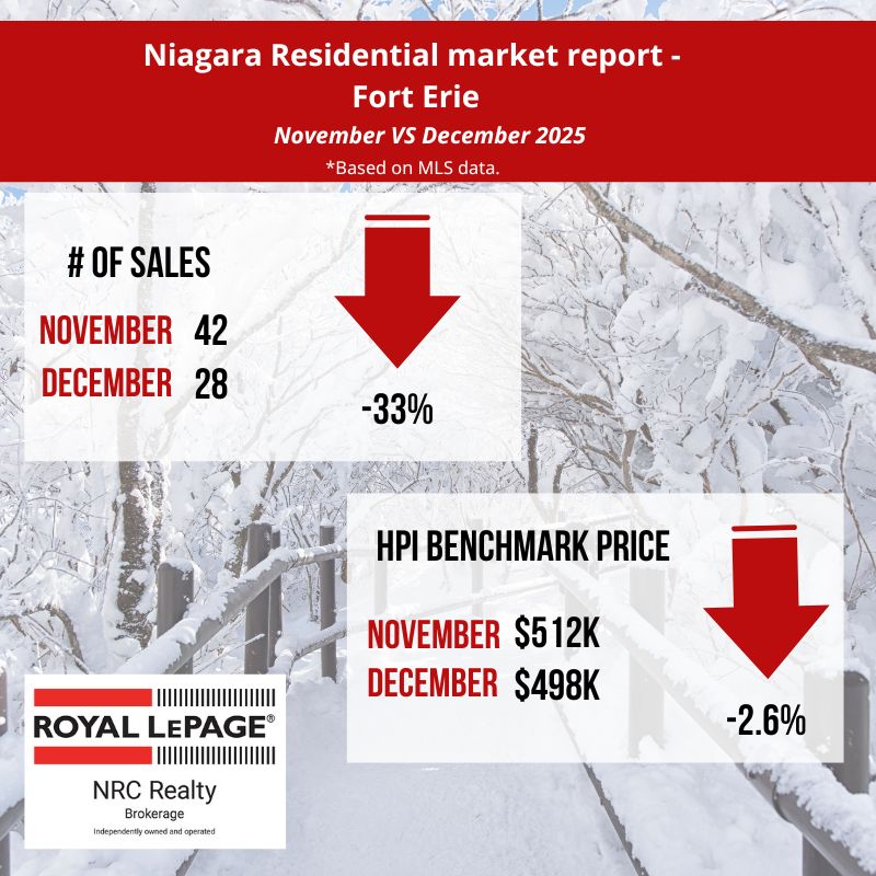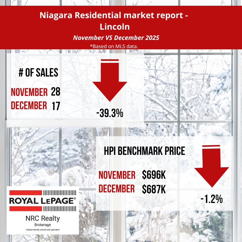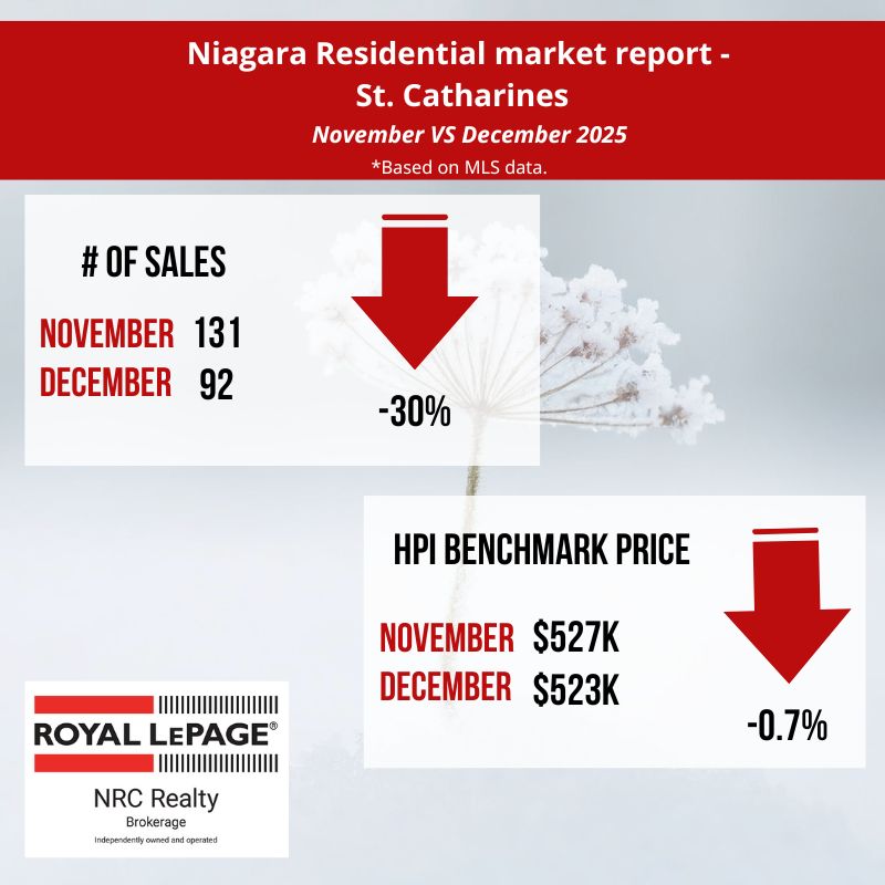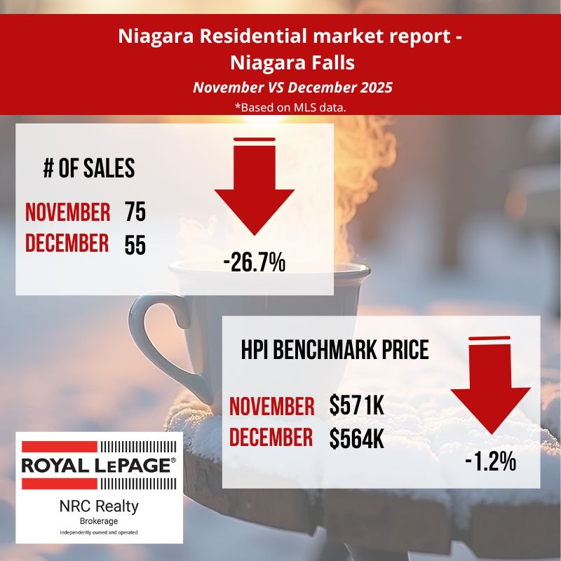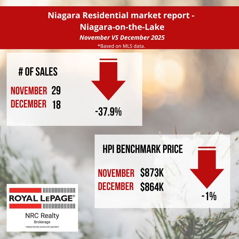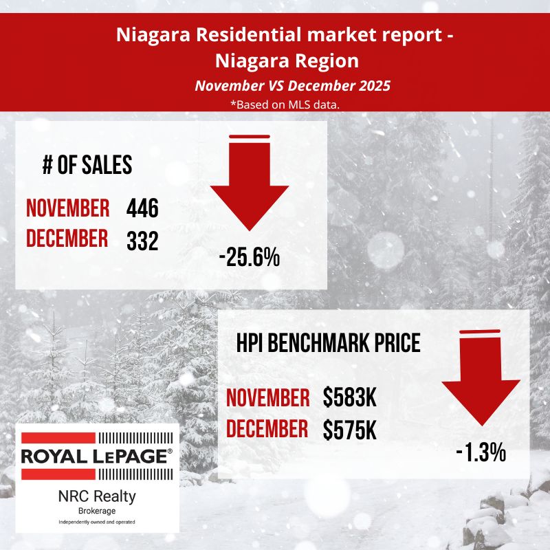 In December, the Niagara Association of REALTORS® listed 482 residential properties compared to 1050 in November 2025. The average days it took to sell a home in December 2025 was 61 days, a 22 % increase from November 2025. (source: niagararealtor.ca)
